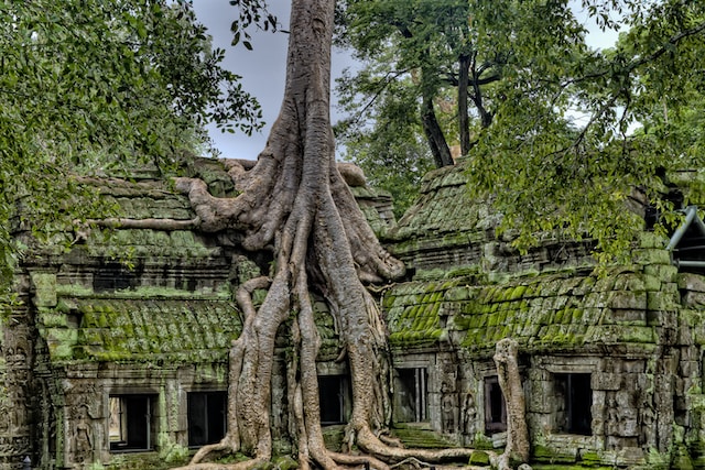 2) 따 프롬: 자연의 품 정글 한가운데로 모험을 떠나 거대한 나무뿌리와 기어 다니는 덩굴에 휩싸인 시간이 얼어붙은 것처럼 보이는 사원인 따 프롬을 발견하세요. 이 분위기 있는 설정은 자연의 덩굴손으로 무성한 안뜰과 좁은 통로를 탐색하면서 탐험과 모험의 감각을 불러일으킵니다. 고대의 돌과 살아있는 나뭇잎 사이의 섬세한 균형은 역사와 자연이 아름다움과 탄력의 춤으로 얽혀 있는 매혹적인 장면을 만듭니다.